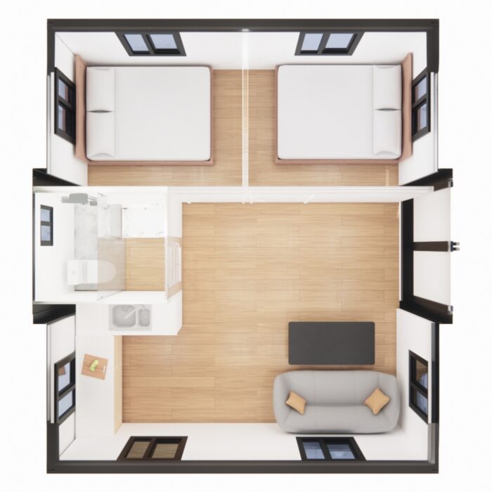 Flexibility is key with Container Living Houses. The interior layout can be tailored to meet different needs, ranging from a compact one-bedroom, one-living room space to a four-bedroom, two-living room design. Whether you’re setting up a vacation home, an office, or temporary shelter, these homes offer adaptable configurations to suit specific requirements.
