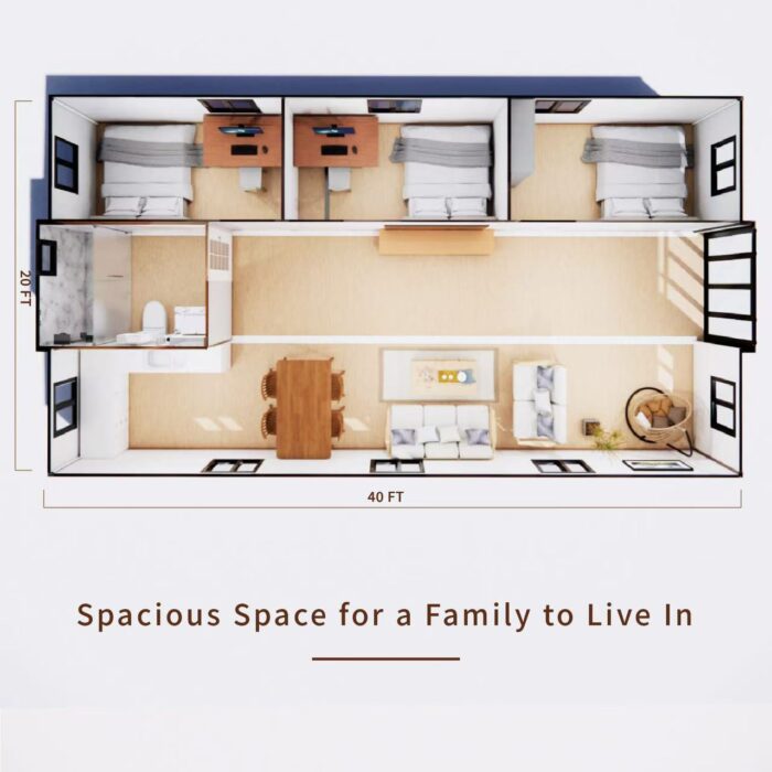 Flexibility is key with Container Living Houses. The interior layout can be tailored to meet different needs, ranging from a compact one-bedroom, one-living room space to a four-bedroom, two-living room design. Whether you’re setting up a vacation home, an office, or temporary shelter, these homes offer adaptable configurations to suit specific requirements.